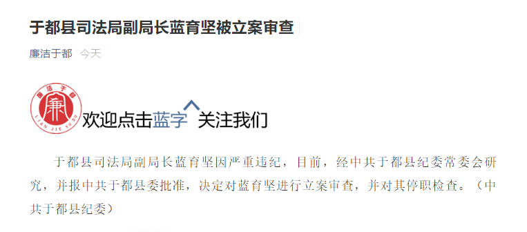 今日,廉洁于都微信公众号发布消息称,于都县司法局副局长蓝育坚因严重违纪,目前,经中共于都县纪委常委会研究,并报中共于都县委批准,决定对蓝育坚进行立案审查,并对其停职检查。
