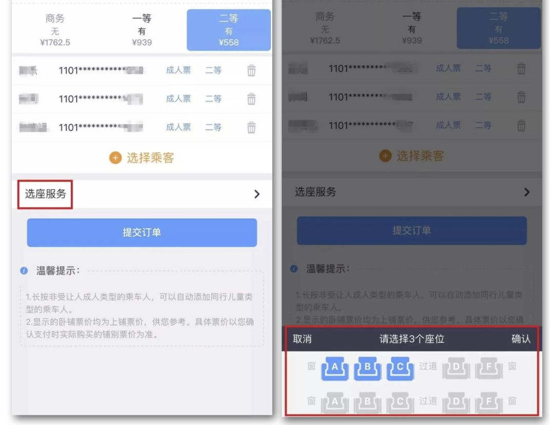 旅客通过12306网站或12306手机客户端购票时,可以根据系统提供的座位示意图选择座位。如上图所示,当你点击“选座服务”后,页面下方出现两排座位,可自主选择座位组合方式,点击“确认”后“提交订单”。当剩余座位无法满足旅客需求时,系统将自动进行配座。