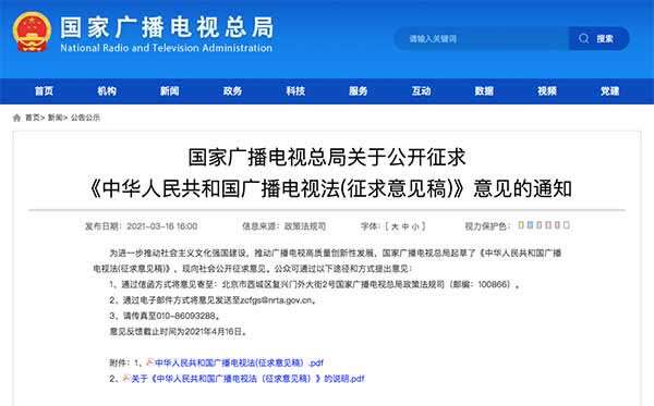 3月16日,国家广播电视总局发布《中华人民共和国广播电视法(征求意见稿)》(以下简称“征求意见稿”),向社会公开征求意见。征求意见稿分为总则、业务准入、制作播放、传输覆盖、公共服务、扶持促进、安全保障、监督管理、法律责任和附则,共10章80条。意见反馈截止日期为2021年4月16日。