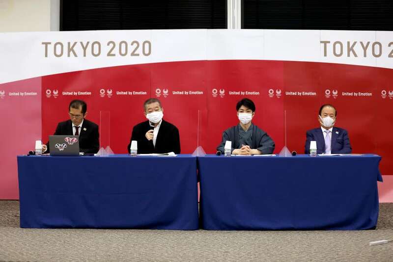 图为2020年12月23日,佐佐木宏(左二)在新闻发布会上。新华社发(东京奥组委供图)
