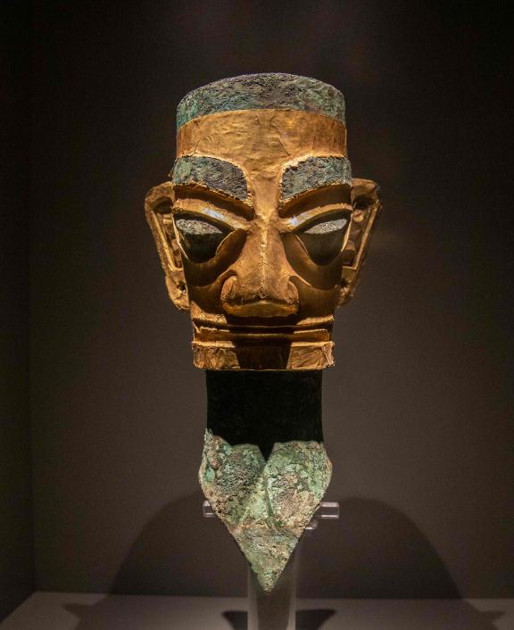 三星堆出土了很多金面具,其中不少贴在青铜人像的脸上,就像是黄金面膜,古蜀人采用这种方式,体现对黄金的崇拜。