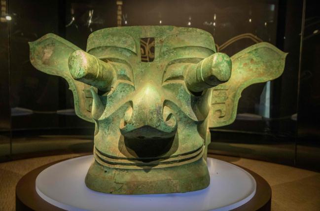 纵目面具重80公斤,眼睛从眼眶伸出来,16厘米长,两个耳朵展开后,面具达138厘米宽,象征千里眼、顺风耳,是蜀王蚕丛的写照。