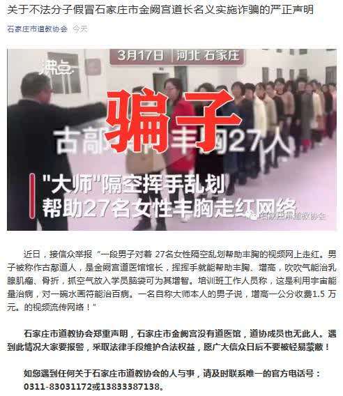 中新网3月19日电 近日,一段“男子被称作古鄗道人,是金阙宫道医馆馆长,对着27名女性隔空乱划帮助丰胸”的视频引发关注。石家庄市道教协会19日通过微信公众号发布声明称,石家庄市金阙宫没有道医馆,道协成员也无此人。遇到此情况要报警,采取法律手段维护合法权益。