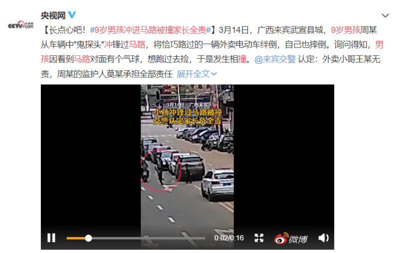 3月14日,广西来宾武宣县城,9岁男孩周某从车辆中"鬼探头"冲锋过马路,将恰巧路过的一辆外卖电动车绊倒,自己也摔倒。询问得知,男孩因看到马路对面有个气球,想跑过去捡,于是发生相撞。@来宾交警 认定:外卖小哥王某无责,周某的监护人莫某承担全部责任。