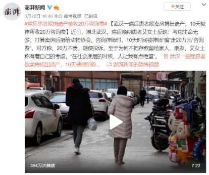 【武汉一癌症患者欲卖房捐出遗产,10天被律所收20万咨询费】近日,湖北武汉。癌症晚期患者艾女士反映:考虑生命无多,打算卖房后捐给动物协会,咨询律师时,10天时间被律师“骗”走20万元“咨询费”。对方称,20万不贵,随便投诉。至于为何不把存款留给家人、朋友,艾女士称有着自己的考虑,“在社会底层的时候,人让我有点绝望”。