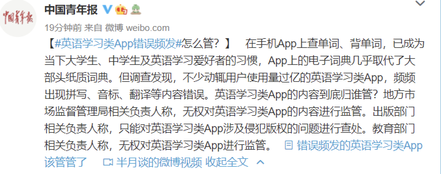 这些APP中都有哪些错误?记者在微博、网页、贴吧等平台搜索,获得关于英语学习类App上存在的拼写及词义类错误19处,主要错误内容为汉语解释错误、英语字母顺序排列错误、词组意思错误等,不仅涉及中英词典,还涉及中德、中日等词典,目前大多已更正。