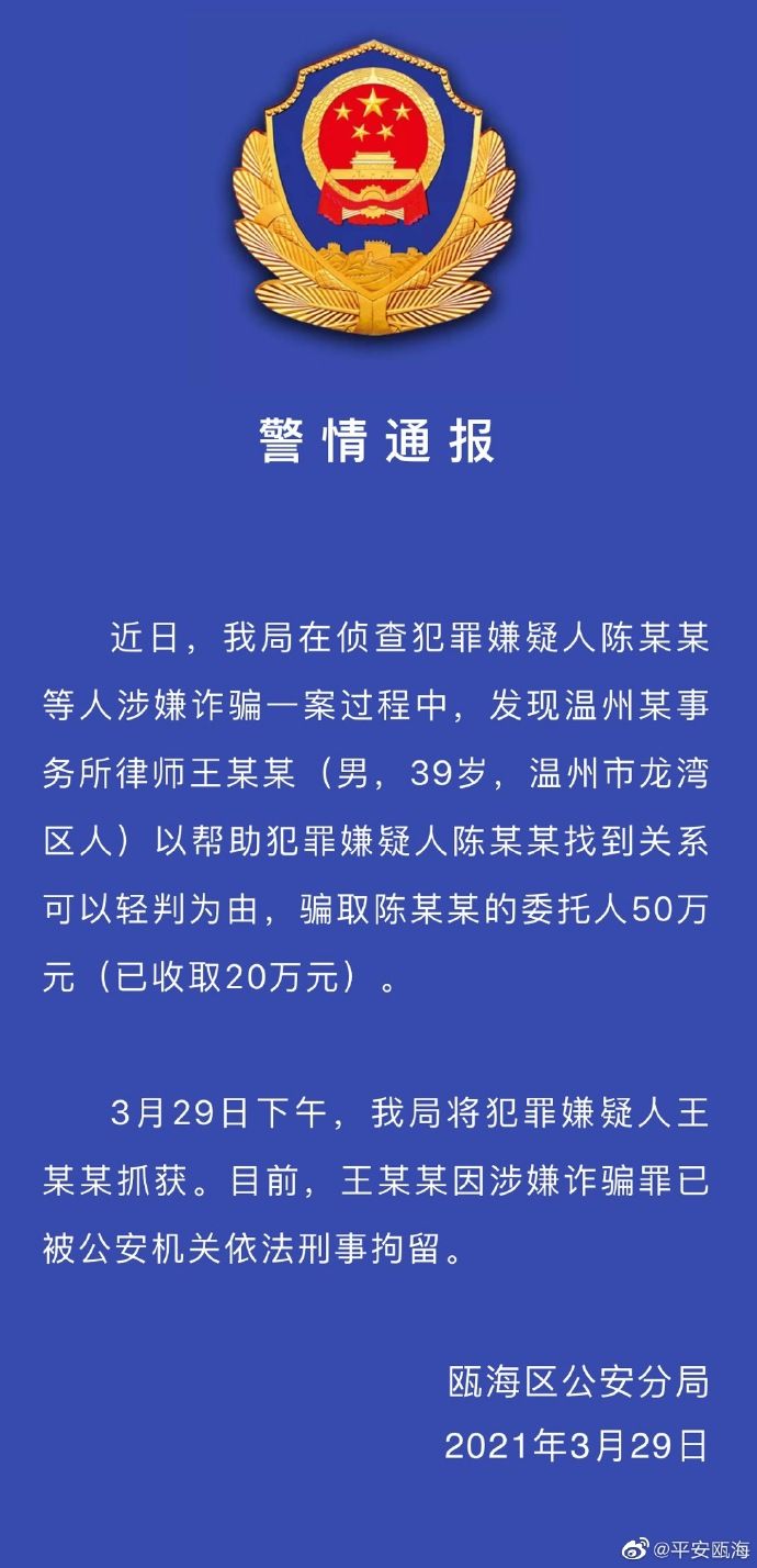 近日,温州市公安局瓯海区分局在侦查犯罪嫌疑人陈某某等人涉嫌诈骗一案过程中,发现温州某事务所律师王某某(男,39岁,温州市龙湾区人)以帮助犯罪嫌疑人陈某某找到关系可以轻判为由,骗取陈某某的委托人50万元(已收取20万元)。