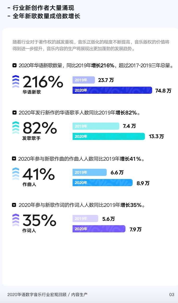 从宏观来看,2020年音乐行业整体内容生产规模进一步提升,新歌数量成倍数增长。2020年华语新歌数量达到74.8万,同比2019年增长216%,超过2017-2019三年总量。在新歌数量增长背后,2020发行新作的华语歌手人数同比增长82%,达到13.3万人。更多行业新人如雨后春笋般涌入,市场活力显著提升。