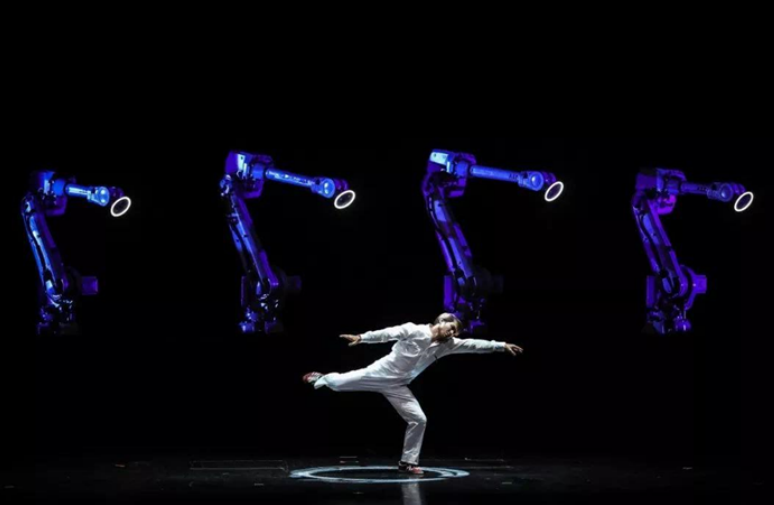 2018年,导演张艺谋指导的观念演出《对话·寓言2047》里,上演了一段机械臂与影子共舞。两支机械臂出现在舞台右侧,舞者则