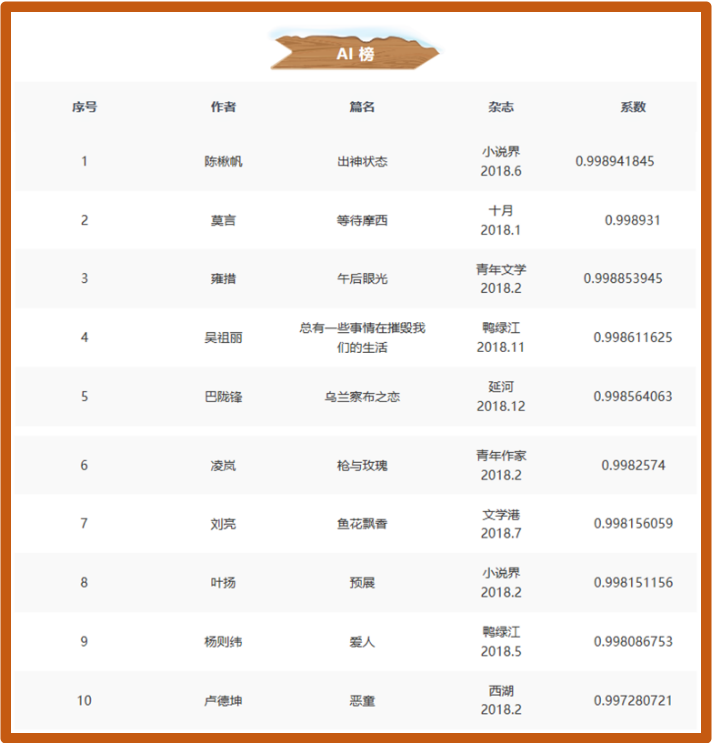 有一篇作品以0.00001分,小数点以后四个零的非常微弱的优势超过了莫言老师,登顶人工智能文学榜的榜首。这篇作品正是陈揪帆发表的《出神状态》