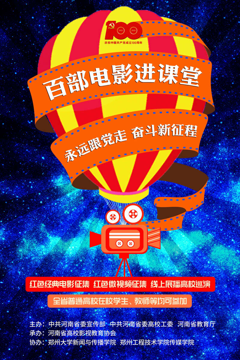 中国青年报客户端讯(中青报·中青网记者 潘志贤)让红色经典影片成为思政教育的生动教材。河南省委宣传部、河南省委高校工委、河南省教育厅日前印发《关于开展“100部电影进课堂”——“永远跟党走 奋斗新征程”庆祝建党100周年活动的通知》,决定开展“百部电影进课堂”活动。