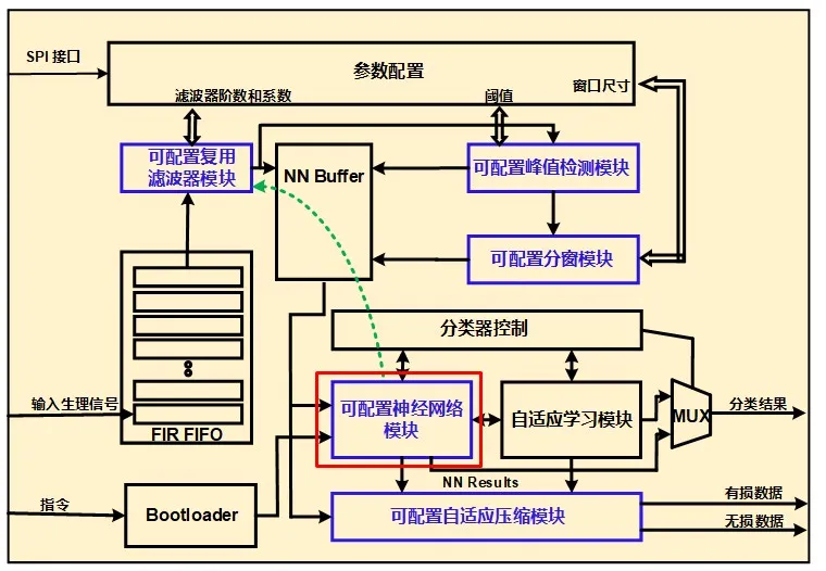 另外,现有的通用AI处理芯片主要存在几个方面的不足:一方面,它们的功耗一般在毫瓦级别,不适合应用在超低功耗的可穿戴、可植入式健康监测。另一方面,它们内部并没有设计用于生理信号处理模块,例如信号滤波、峰值检测等,因此不能直接应用在智能健康检测设备中。