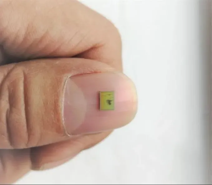 最近,电子科技大学信息与通信工程学院博士生刘嘉豪所在的团队,设计制作出了一款轻盈的生理信号人工智能处理芯片,只有一小片雪花那么大。用镊子轻轻把芯片夹起来放在大拇指的指甲盖上,可以放十几片。