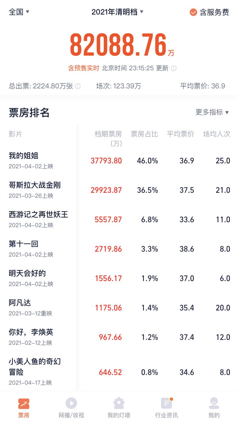 《我的姐姐》在这个清明节档,保持着明显的猛烈势头。4月2日晚上才开始正式上映,六个小时的票房就超过了好莱坞大片《哥斯拉大战金刚》。4月3日票房破2亿,4月4日排片超越《哥斯拉大战金刚》,不断发酵的话题度和口碑,都让这部电影一早就毫无悬念锁定了清明节档的冠军。