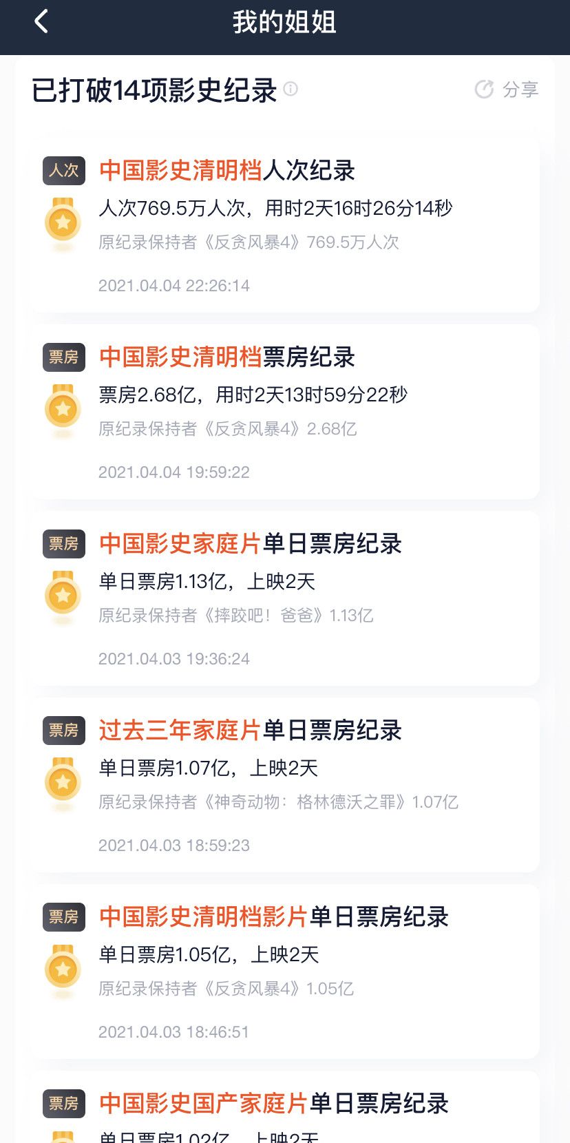 上映首日,《我的姐姐》的排片占比仅是《哥斯拉大战金刚》的一半,却登顶4月2日票房冠军,之后虽然两部影片的差距并不大,但《姐姐》每天都几乎小胜一筹。据灯塔专业版统计,截至清明小长假结束,《我的姐姐》已经打破包括中国影史清明档票房纪录、清明档单日票房纪录、观影人次纪录、家庭片单日票房等14项纪录。