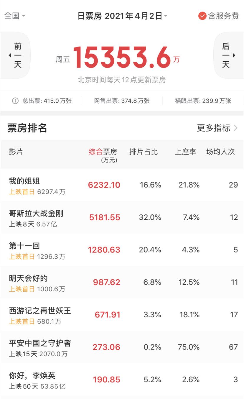 4月2日票房榜。