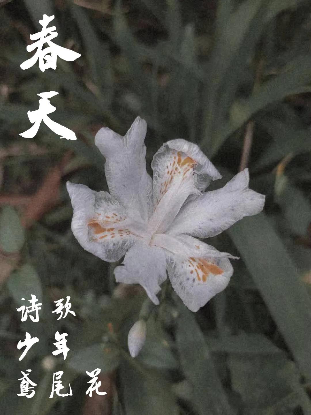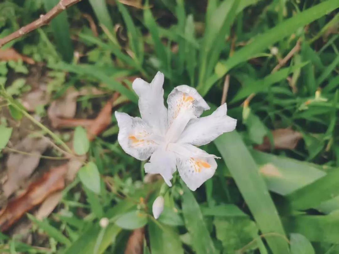 它的四瓣花瓣近乎透明,单薄的身影像极翩翩欲飞的白蝴蝶,花瓣中心是橘色的斑点,凝成漩涡状,引得大家挪不开脚。用识花君拍照搜索,显示它的名字是扁竹兰,属鸢尾科,为了好听,于是都叫它鸢尾花。