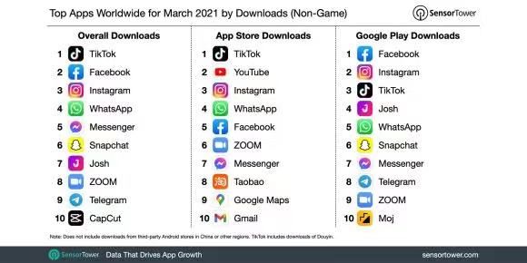 4月9日,研究机构Sensor Tower发布数据,TikTok蝉联2021年第一季度全球移动应用下载量榜首,其中3月下载量超过5800万。