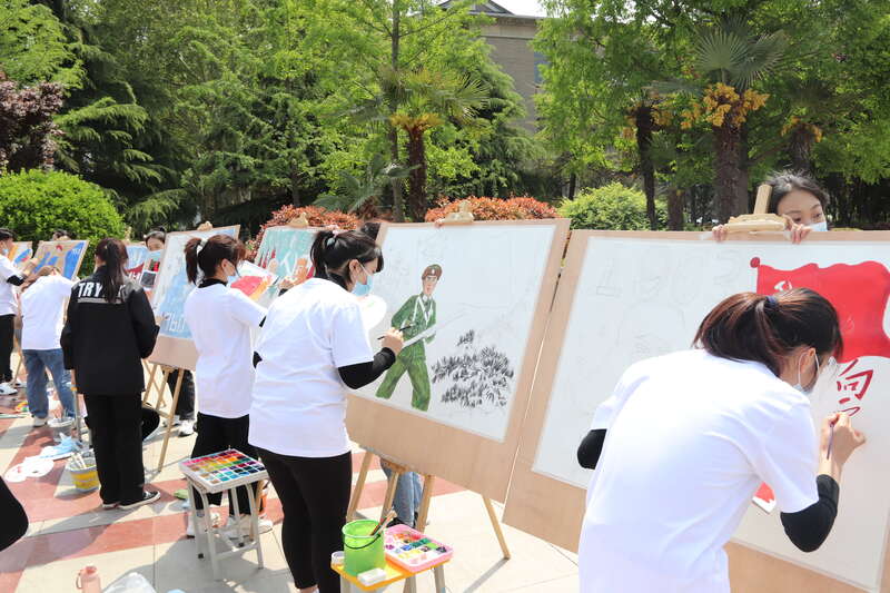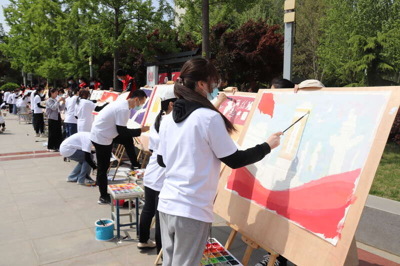 该校美术学院100名大学生同时绘制100幅红色主题水粉画,这些年轻的大学生不仅锻炼了绘画技能,也在创作中进行了党史学习,补充“营养”,寻找灵感。在广场上驻足欣赏的师生员工,也在观赏中厚植了爱党、爱国的情感。