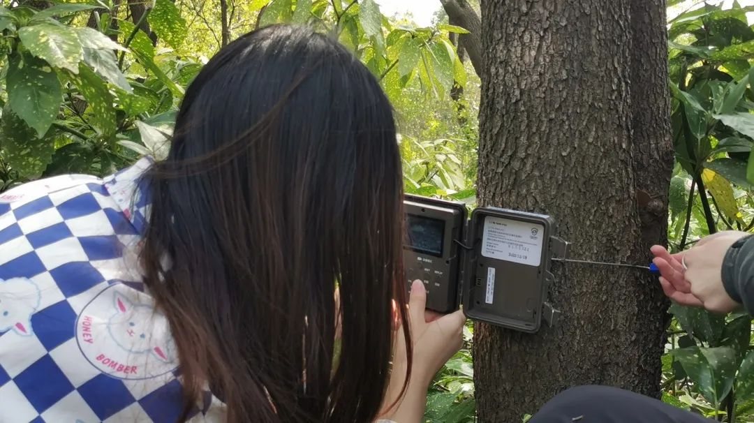 检查红外相机是李骥玄的例行工作。调查初期,团队成员在复旦校区内布设了15台红外相机,每隔一两周,团队成员便会找到隐蔽在树丛中的红外相机,查看拍摄记录,寻找可能出现的野生动物。