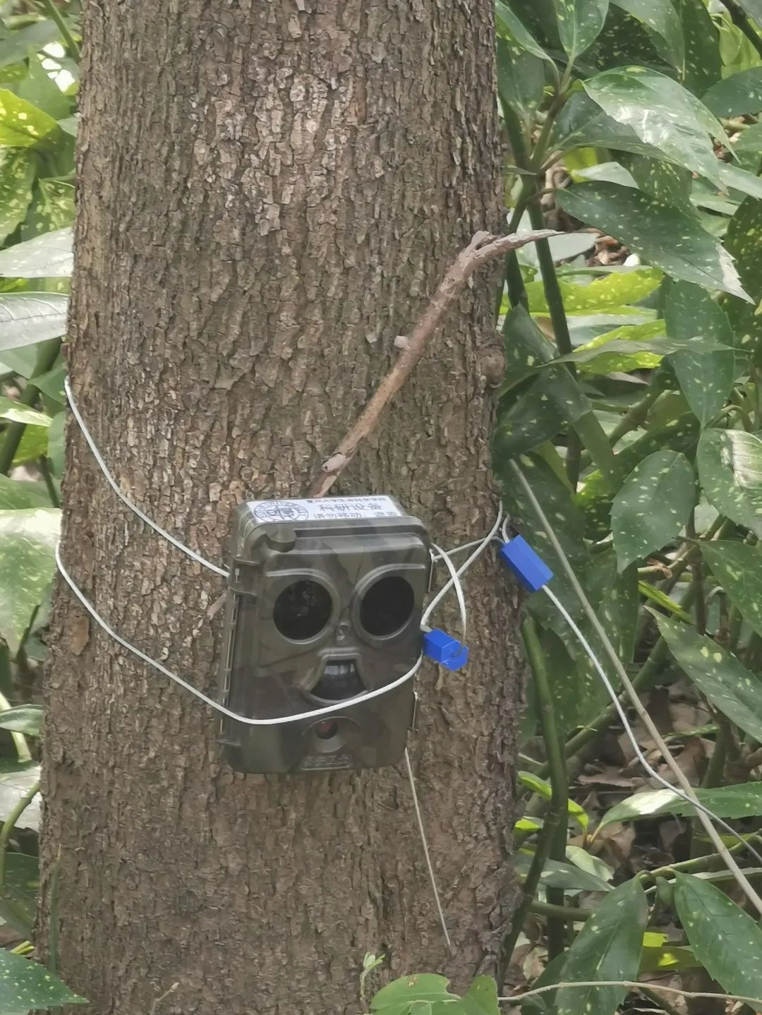 如果一个点位的相机里拍到人的概率大,也是有价值的。“因为人常去的地方,野生动物去的概率就降低了。我们就要换个点位了。”在检查红外相机的过程中,李骥玄曾发现红外相机被人动过的痕迹。他便将相机移至有灌木丛遮挡的另一棵树上,用钢丝绕了相机三圈,用力收紧,折掉相机前的树枝,在相机背后垫了一根木棍,让镜头朝下倾斜。“我们主要的拍摄对象是小型野生动物。”李骥玄解释。