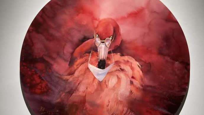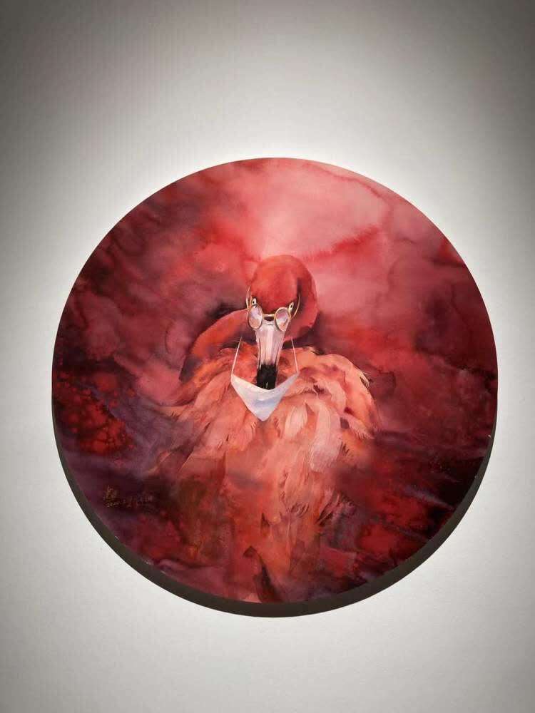 他画火烈鸟,浴火重生的火烈鸟在他的画笔下,戴上了突兀的眼镜和口罩。“眼镜代表着人类对防疫的知识渴望,口罩是这个时间段的标志。”