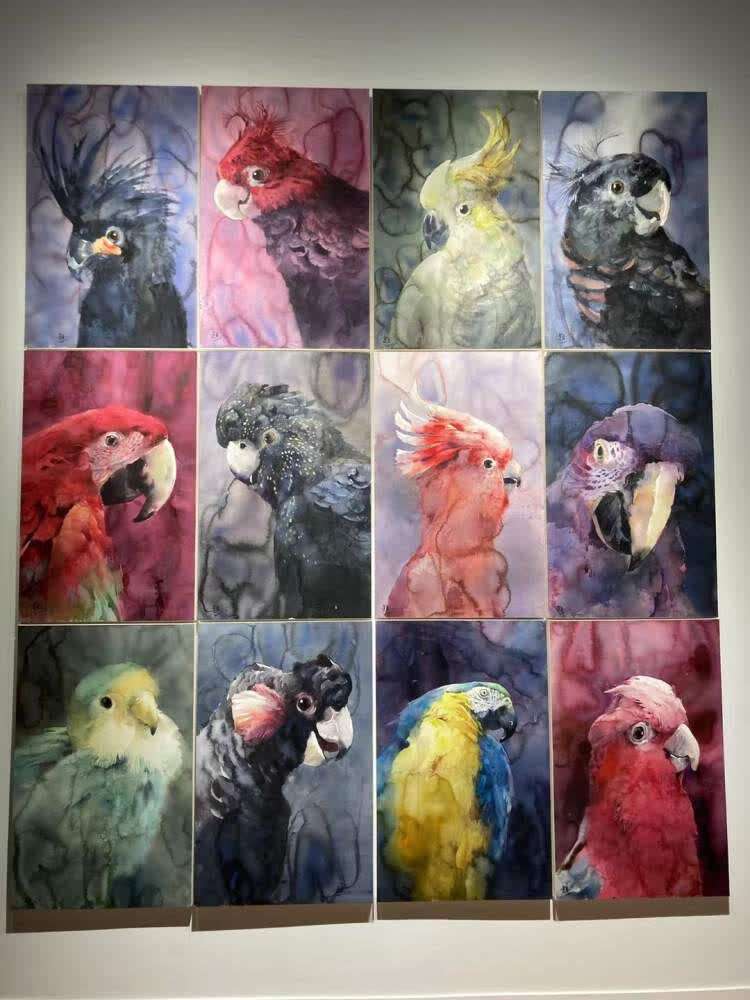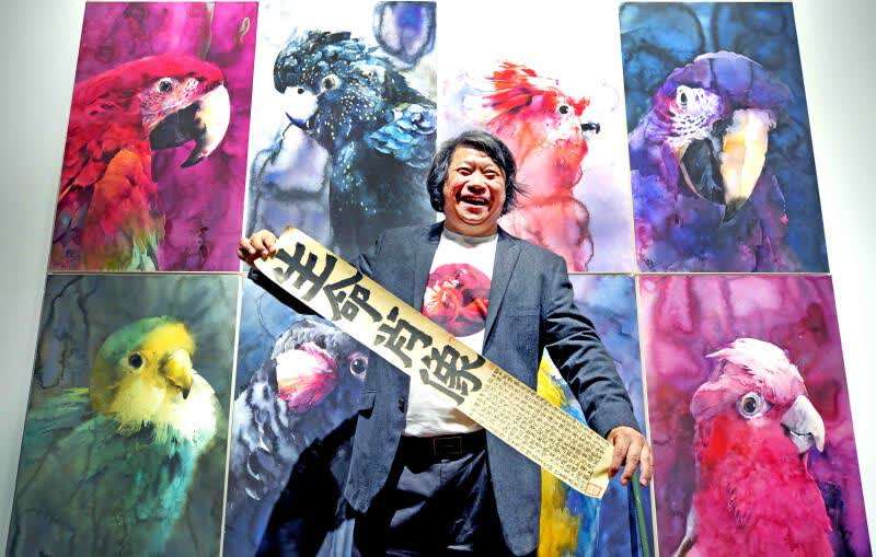 他启笔画画。他把鹦鹉画得如人类的表情肖像,黑漆漆眼睛寓意生命尊严;黑色猩猩的眼神以全知全能的视角俯瞰众生。