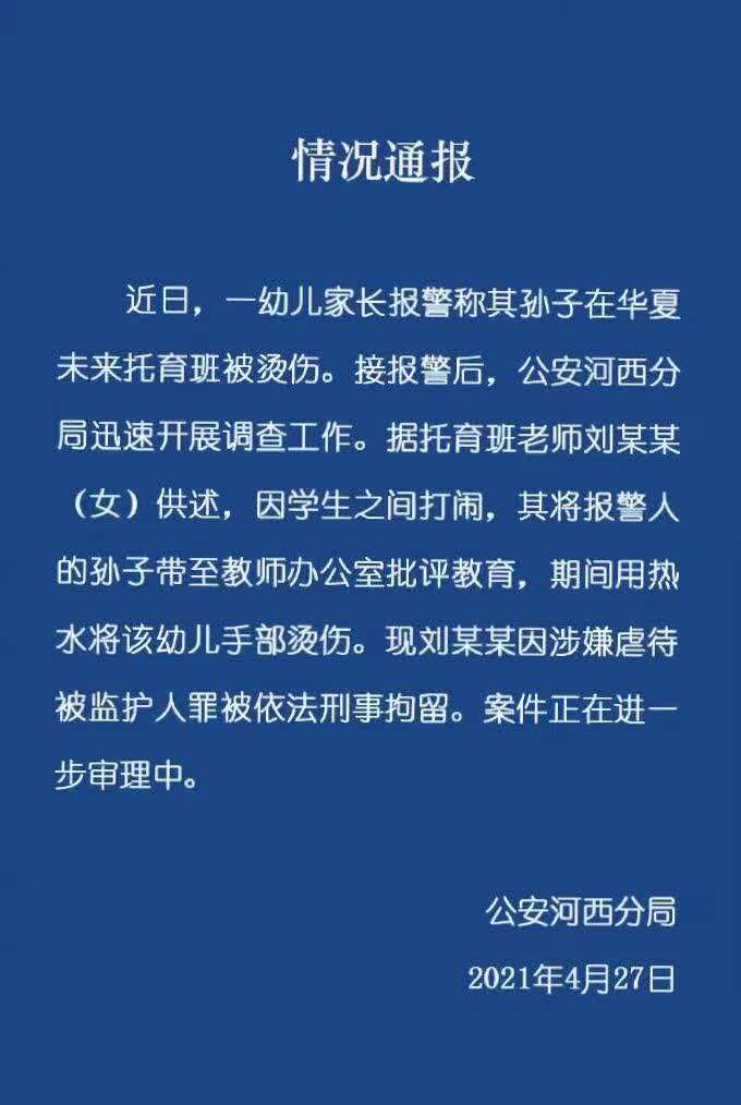 天津市公安局河西分局通报称,近日,一幼儿家长报警称其孙子在华夏未来托育班被烫伤。接报警后,公安河西分局迅速开展调查工作。据托育班老师刘某某(女)供述,因学生之间打闹,其将报警人的孙子带至教师办公室批评教育,期间用热水将该幼儿手部烫伤。现刘某某因涉嫌虐待被监护人罪被依法刑事拘留。案件正在进一步审理中。