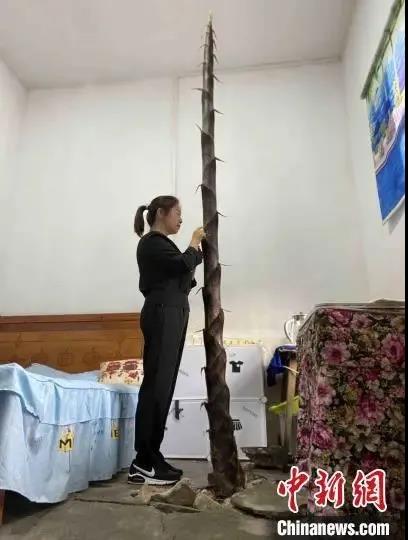 头一回见到房屋里面长竹笋的莫小艳也感到十分新奇,并没有直接将竹笋挖掉,而是选择让它陪伴着自己,做自己的“室友”,并用手机记录下了竹笋生长的情况。随着时间的推移,竹笋每天可以长3厘米左右,不到20天,现在的竹笋已经长到了天花板,达到3米多高。