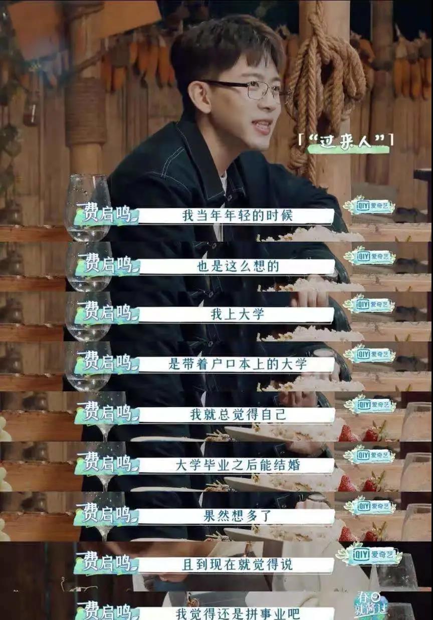 在综艺《春日酱》节目中,作为春日少年中最大年龄的费启鸣聊到本以为觉得自己大学毕业之后就能结婚,但随即又提出有这样的想法还是太年轻,如今生活有太多羁绊,重心早已都转移到了拼事业上。