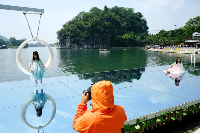 游客在象鼻山公园的网红打卡地留影。 中青报·中青网记者 谢洋摄