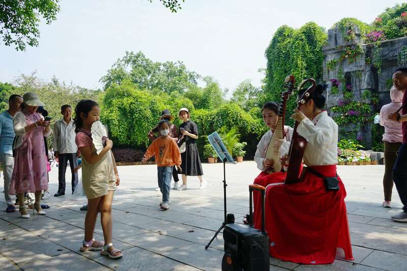 游客在欣赏景区的民乐表演。 中青报·中青网记者 谢洋摄