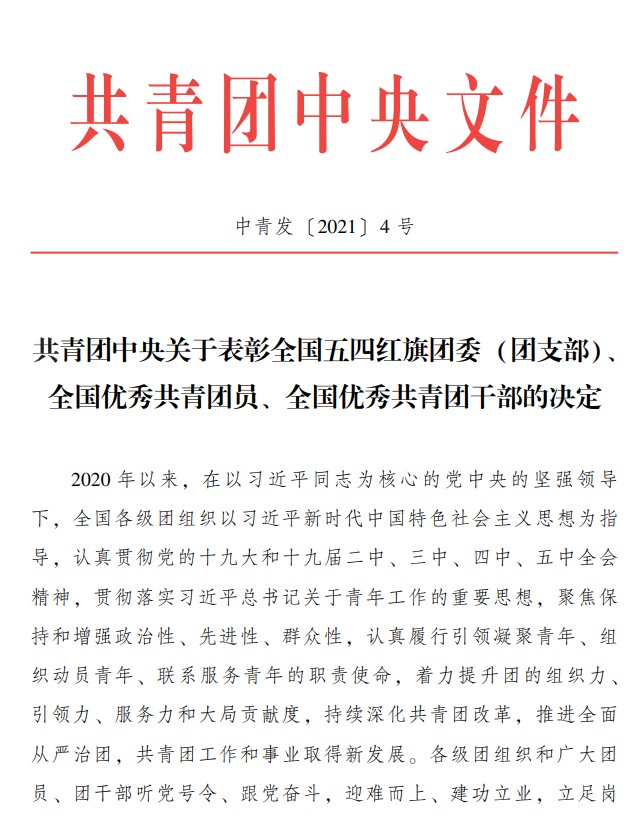“五四青年节”前夕,共青团中央发布表彰决定,我校团委获评2020年度“全国五四红旗团委”。“全国五四红旗团委”是共青团中央授予全国基层团组织的最高荣誉,是推进共青团改革向纵深、向基层延伸的重要载体。此次为我校团委近十年来首次获得此项殊荣。