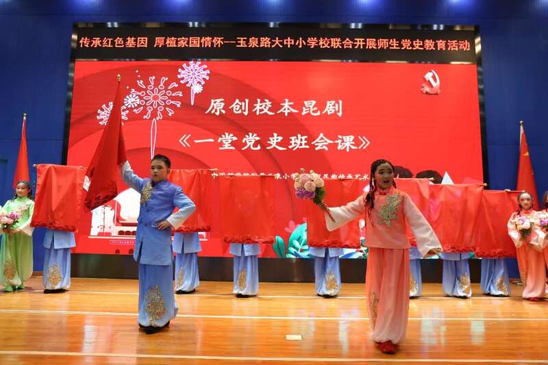 图说:玉泉小学国乐团的孩子们现场表演器乐合奏《我和我的祖国》和昆曲团的孩子们原创的昆歌《一堂党史班会课》。