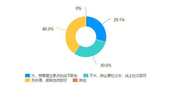 尽管线下社交对于部分人群来说会有困难,但问卷中近半数的大学生认为应该积极参与线下社交,拓展线下人脉圈。
