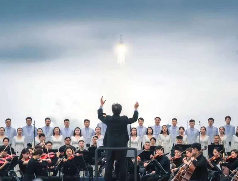 在著名指挥家夏小汤执棒指挥下,西安交响乐团演奏了经典曲目《东方红》,以及《行星组曲》选段,并与合唱团特别奉上《没有共产党就没有新中国》《红色娘子军》的经典合唱曲目《万泉河水清又清》《在灿烂的阳光下》等,交响乐伴随着火箭轰鸣声,让观众倍感震撼。