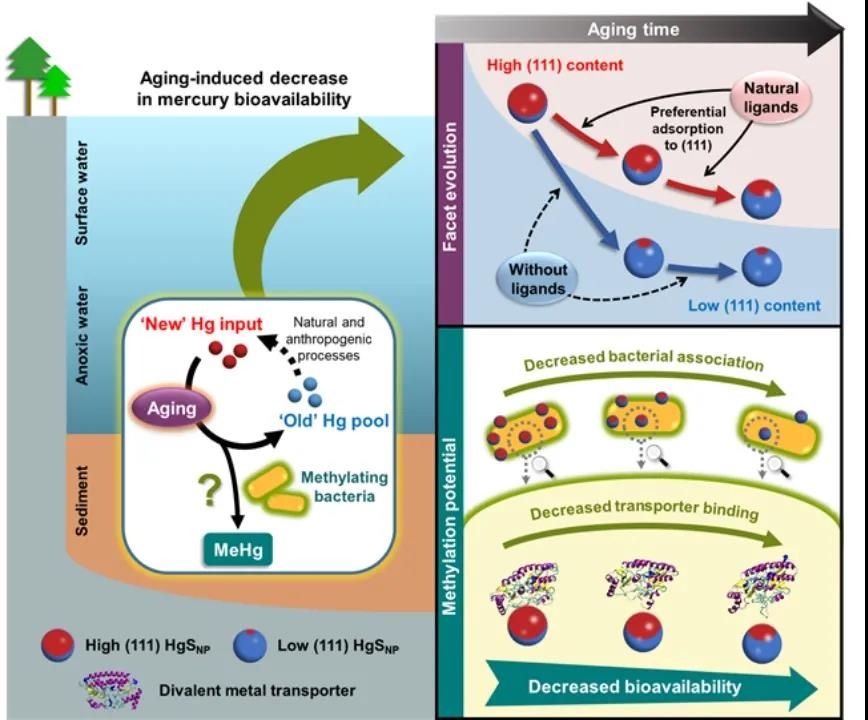 他们发现,天然有机质可通过调控初级纳米粒子的生长方向,影响纳米汞与厌氧细菌金属转运蛋白的结合过程,显著抑制其甲基化潜能的自然衰减,导致富含有机质环境中甲基汞持续地生成和积累。这一突破,为环境汞污染风险评估提供了重要的理论依据,为设计开发高效的甲基汞污染阻控技术提供了崭新思路。