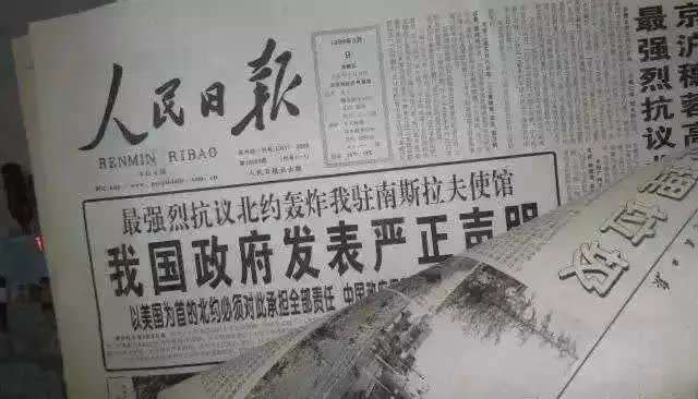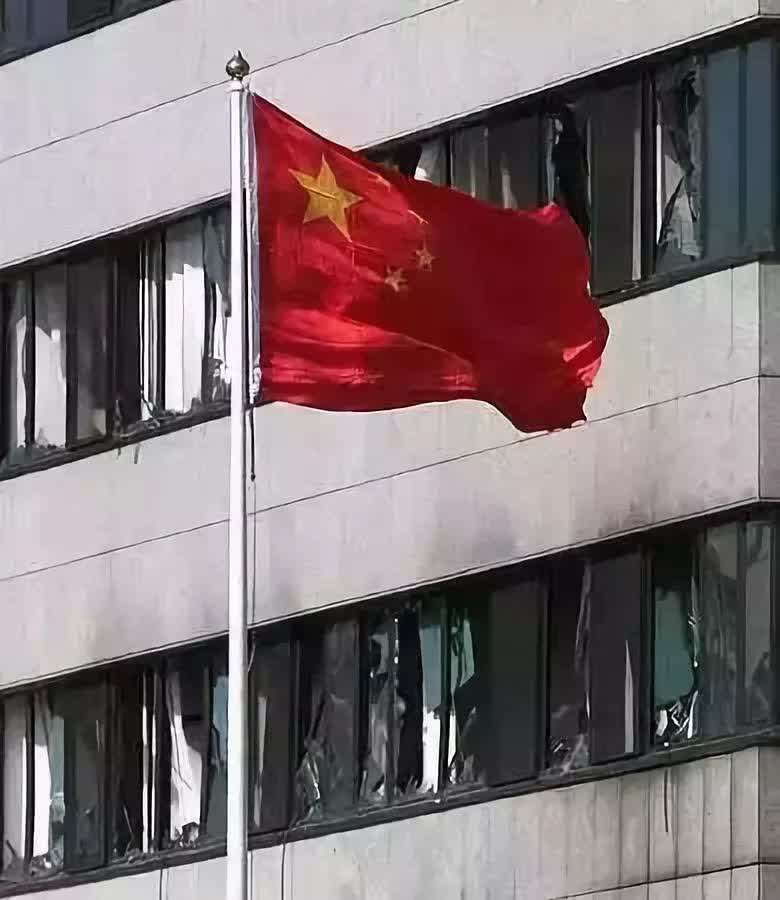 已成废墟的中国驻南联盟大使馆前五星红旗正在飘扬