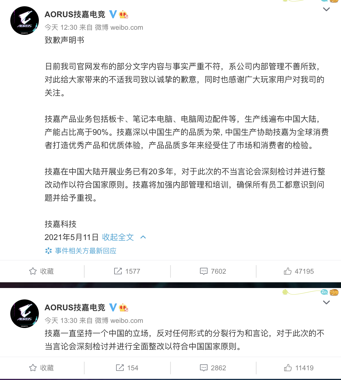 随后,@AORUS技嘉电竞 接连发布致歉声明称,日前官网发布的部分文字内容与事实严重不符,系公司内部管理不善所致,对此给大家带来的不适致以诚挚的歉意。