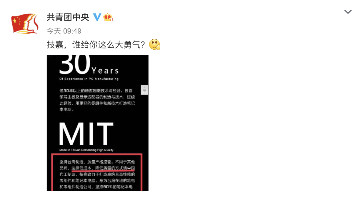 5月11日,@共青团中央 发文点名批评:技嘉,谁给你这么大勇气?