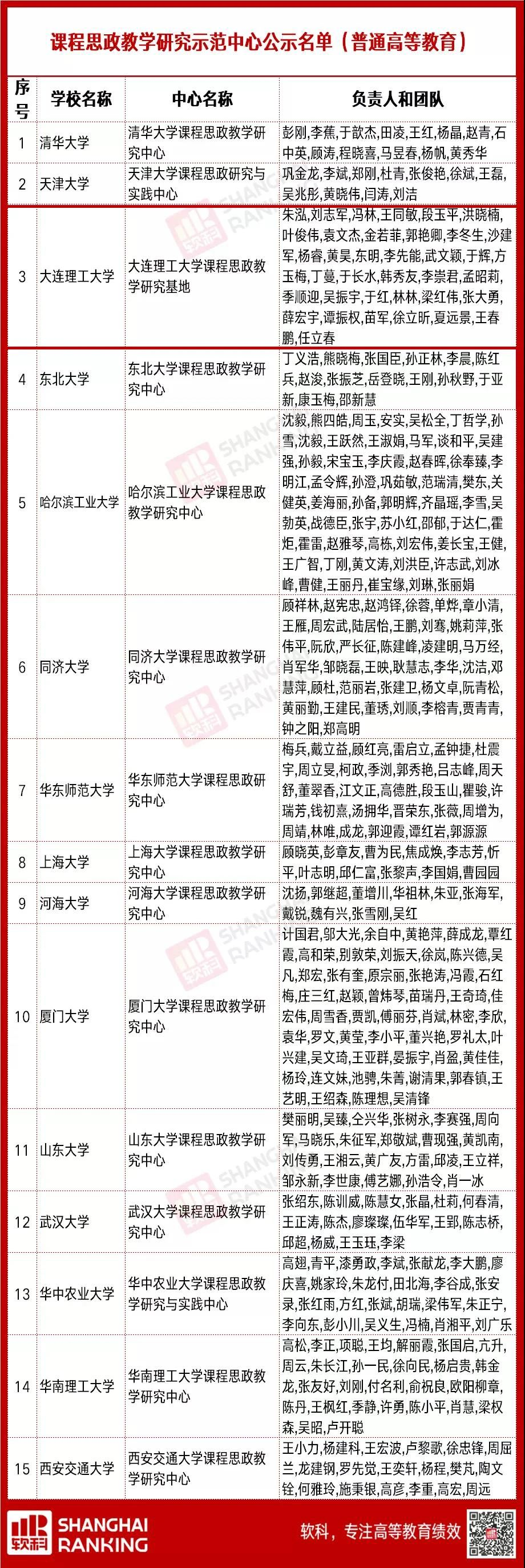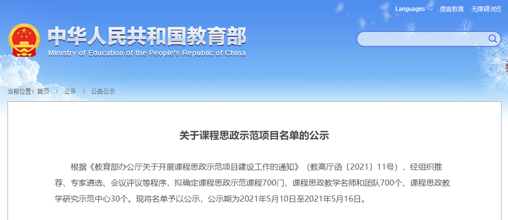 5月10日,教育部发布《关于课程思政示范项目名单的公示》,经组织推荐、专家遴选、会议评议等程序,拟确定课程思政教学研究示范中心30个,我校课程思政教学研究基地成功入选;课程思政示范课程700门、课程思政教学名师和团队700个,我校有3门课程、3个教学名师和团队入选。