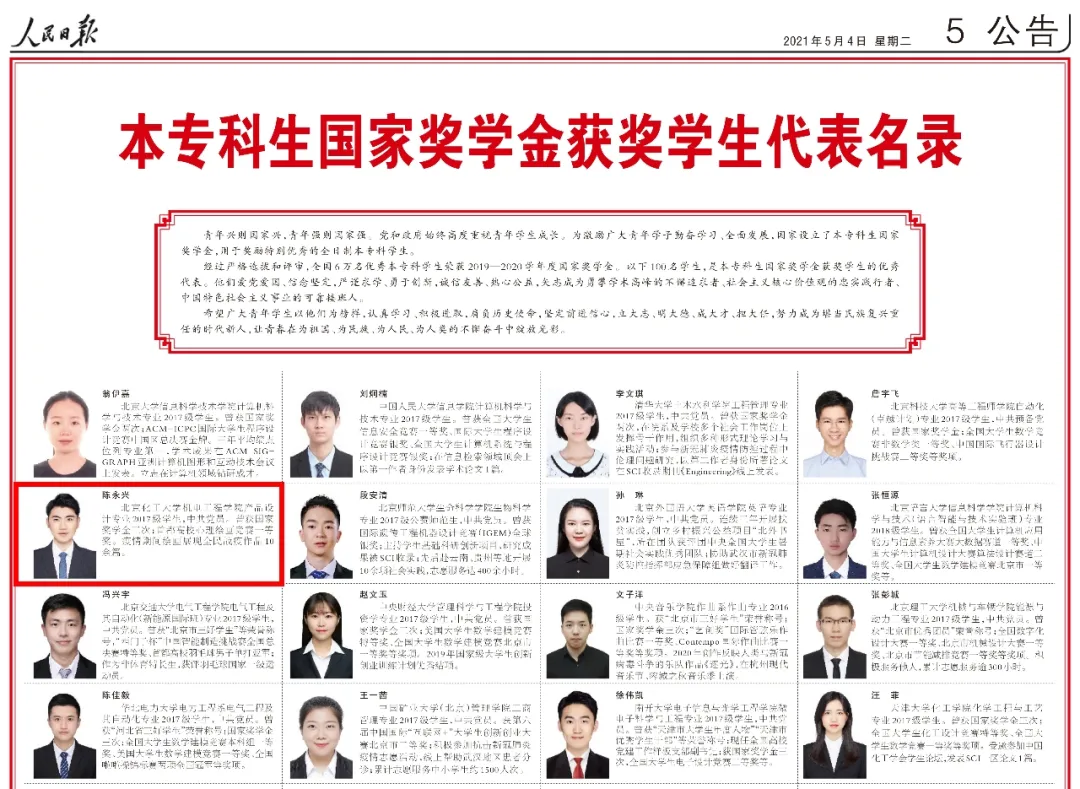 5月4日,《人民日报》专版刊发《本专科生国家奖学金获奖学生代表名录》,北京化工大学机电工程学院产品设计专业2017级学生陈永兴荣耀上榜。