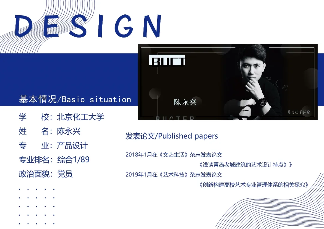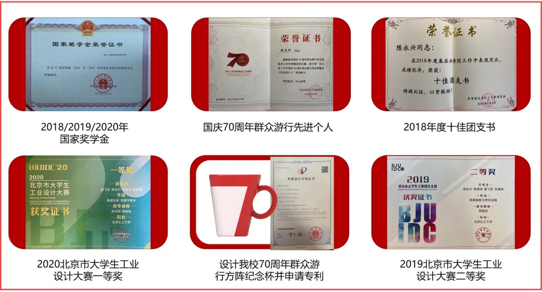 他勤奋好学,担当作为,充分展现新时代学生党员的先锋模范作用,尽己所能为校争光。入学以来,学业综合成绩排名一直位居专业第一,连续三年获评国家奖学金;疫情期间,以“艺”抗疫,多幅作品被主流媒体媒体刊发报道;2019年,为我校“开天辟地”方阵设计专属纪念杯,成功申请专利并制作成品发放给参与师生。担任机电工程学院学生会主席,团支部书记,获评校年度“十佳团支书等12项个人荣誉;学科竞赛方面,斩获首都高校大学生心理绘画竞赛一等奖,北京市工业设计大赛一等奖等国家级、市级荣誉21项。