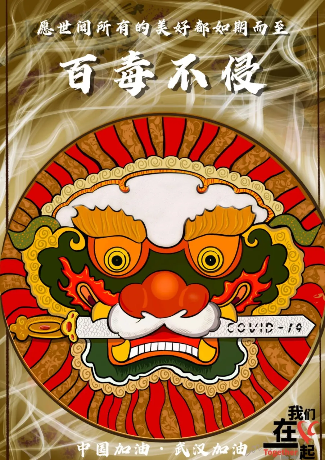 在一幅名为《百毒不侵》的海报作品中,可以看到带有浓厚中国传统文化特色的门饰“铺首”口中衔着一把宝剑,上面写着“COVID-19”(注:新型冠状病毒肺炎英文缩写),极具视觉冲击力。陈永兴解释说,这幅作品以中国传统的建筑门饰“铺首”为灵感,“铺首”作为门上的神兽,寓意驱魔辟邪,守护门神。在这里表达驱散病毒,百毒不侵。向人们传达新春佳节,只要在家隔离,关好大门,必能百毒不侵。
