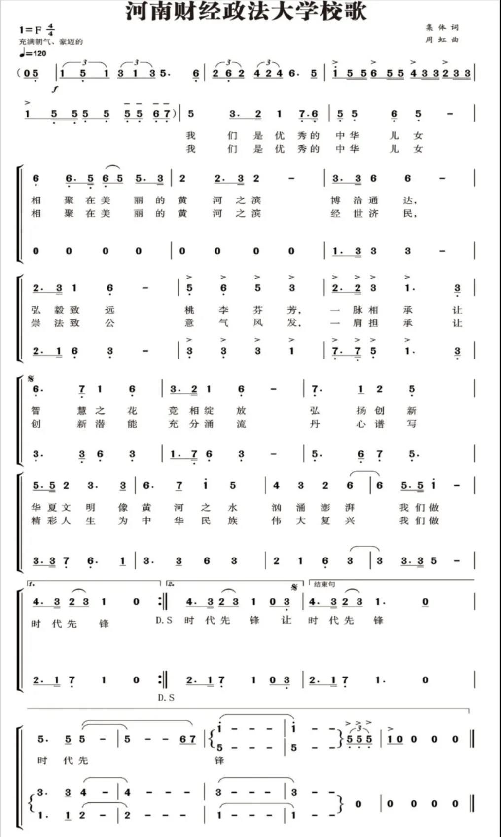 《河南财经政法大学校歌》由集体作词、周虹作曲,旋律激昂,气势豪迈。“根植中原文化沃土,博洽通达,弘毅致远,桃李芬芳,一脉相承。”展现了财经政法学子通晓豁达,学识广博,宽宏坚毅,追求卓越的理想。