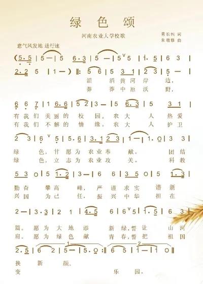 “滔滔黄河岸边,有我们美丽的校园……”每当《绿色颂》的歌声响起,河南农大人立志兴农报国的质朴情感随着歌声流淌而出。这首歌曲由董长纯作词、朱敬修作曲,正式发布于1999年。绿色是农作物的主要颜色,是农业文明的代表颜色。在中国文化中,绿色有生命的含义,选用“绿色颂”作为河南农业大学校歌名称,最能彰显学校特色。