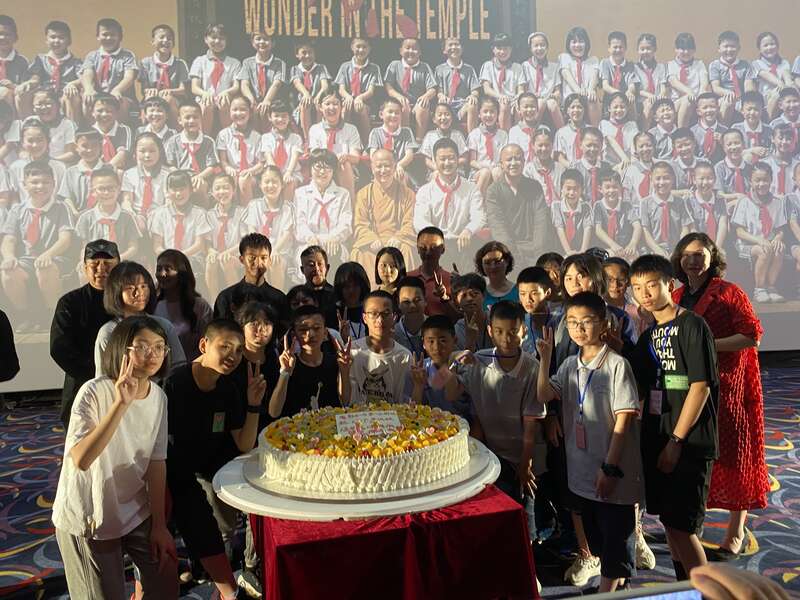 创作团队在首映礼上为“罗汉娃”们庆祝生日。李欣怡/摄