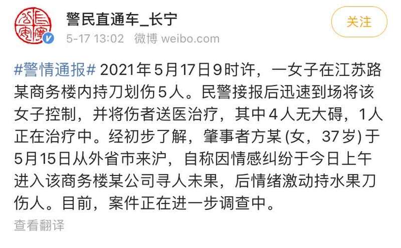 中国青年报客户端上海5月17日电(中青报·中青网记者 魏其濛)上海长宁警方刚刚发布微博,通报一起持刀伤人事件。