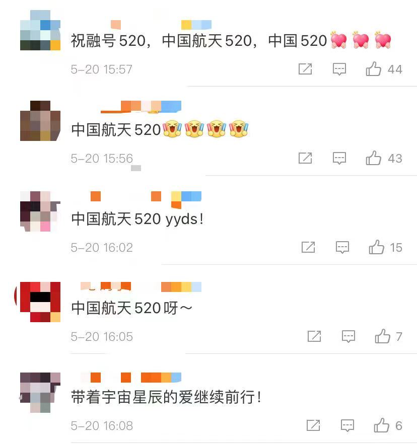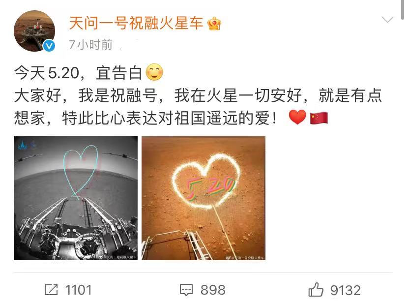 “今天是‘520’,我们期待着祝融号火星车带着对宇宙星辰的爱,继续奔赴前行,发回更多火星的探测成果,带给我们更多好消息。”