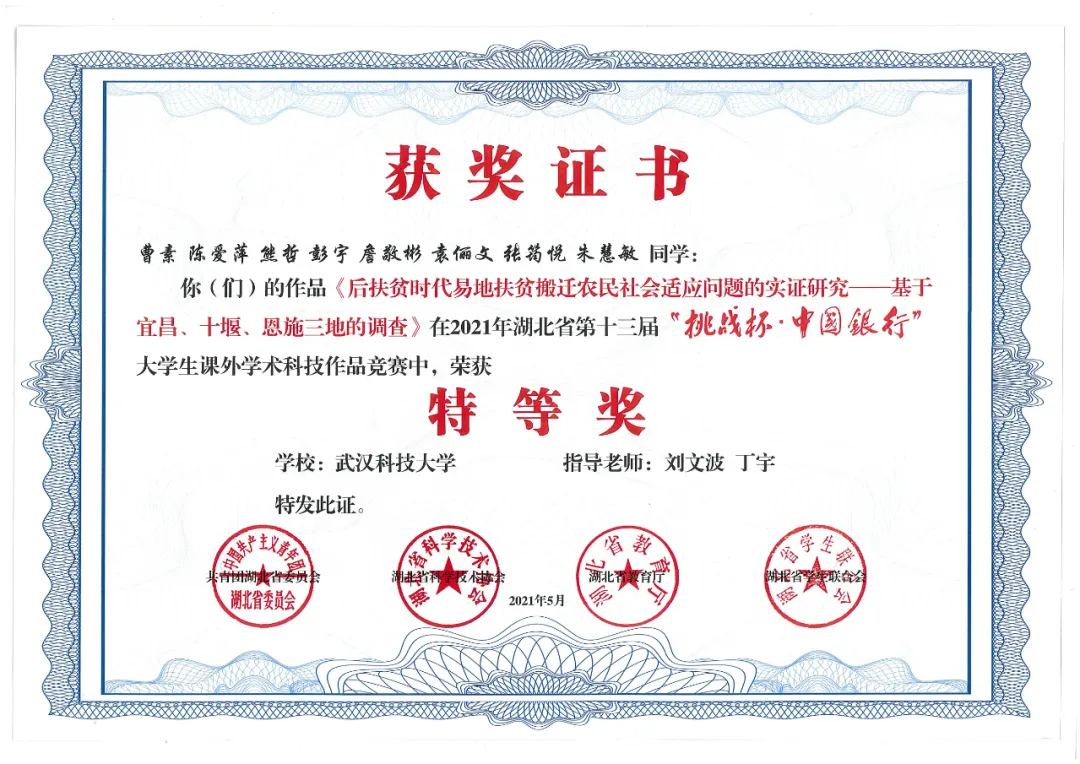 5月19日,湖北省第十三届“挑战杯”大学生课外学术科技作品竞赛闭幕式在中南民族大学落下帷幕,我校斩获特等奖2项、一等奖6项、二等奖1项、三等奖3项,学校总积分排名全省第三、省属高校第一,再创新高。学校再次捧得优胜杯。
